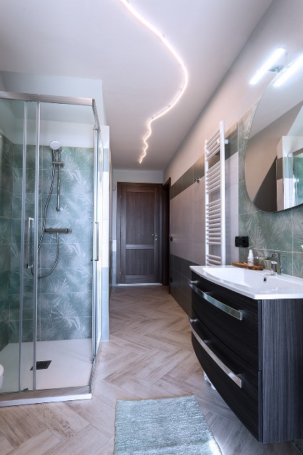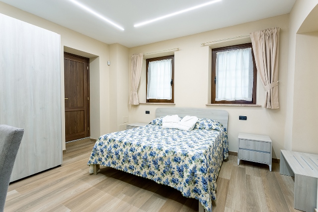 entrance, living room with sofa bed and fully equipped kitchen (equipped with fridge, microwave, induction hob, dishes, dishwasher, flat screen TV), large double bedroom, private internal bathroom with shower (equipped with towels, hairdryer and washing machine) , underfloor heating.