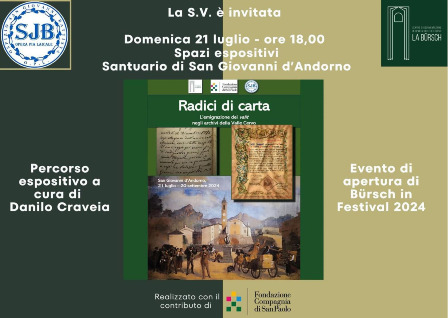Domenica 21 luglio, alle ore 18.00, al Santuario di San Giovanni d’Andorno apre la mostra “Radici di carta: l’emigrazione dei valìt negli archivi della Valle Cervo”, curata da Danilo Craveia per il Centro di Documentazione dell’Alta Valle Cervo. La tematica si integra con quella del “Bürsch in Festival” edizione 2024 che prenderà avvio il 27 luglio. La mostra è visitabile da lunedì a domenica dalle ore 10.00 alle ore 18.00 fino al 20 settembre 2024.