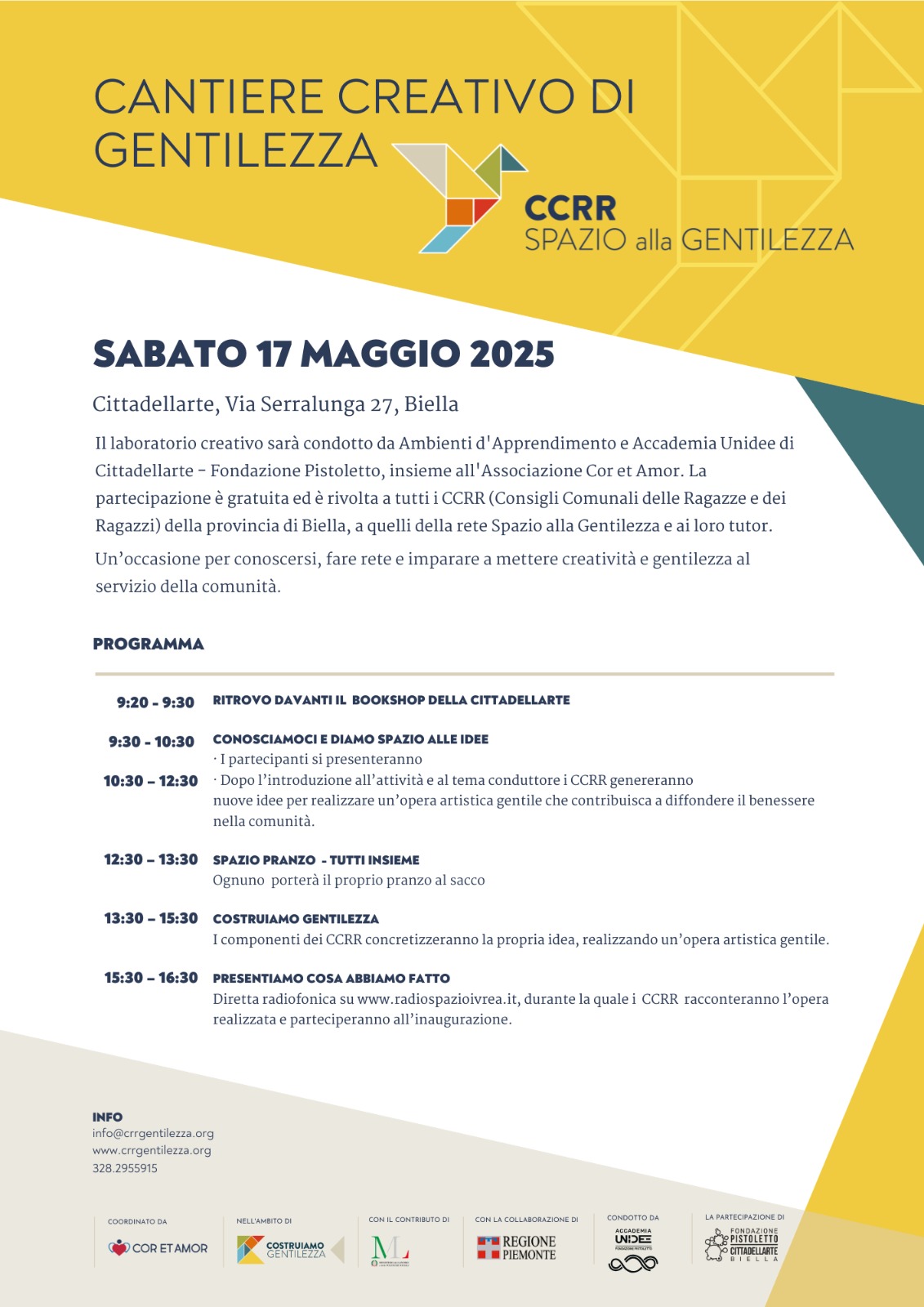 Il laboratorio creativo sarà condotto da Ambienti d'Apprendimento e Accademia Unidee di Cittadellarte - Fondazione Pistoletto, insieme all'Associazione Cor et Amor. La partecipazione è gratuita ed è rivolta a tutti i CCRR (Consigli Comunali delle Ragazze e dei Ragazzi) della provincia di Biella, a quelli della rete Spazio alla Gentilezza e ai loro tutor. Un'occasione per conoscersi, fare rete e imparare a mettere creatività e gentilezza al servizio della comunità.