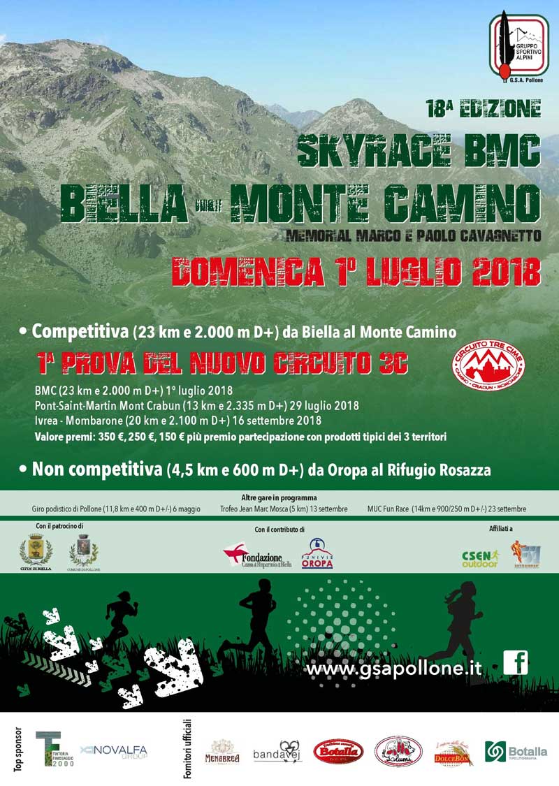 Con grandi novità si svolgerà domenica 1°luglio la 18° edizione dello skyrace BMC, Biella Monte Camino, memorial fratelli Marco e Paolo Cavagnetto, una gara competitiva, organizzata dal GSA Pollone, di 23 km con 2000 metri di dislivello positivo, che è ormai diventata un must del circuito skyrace locale e non solo.